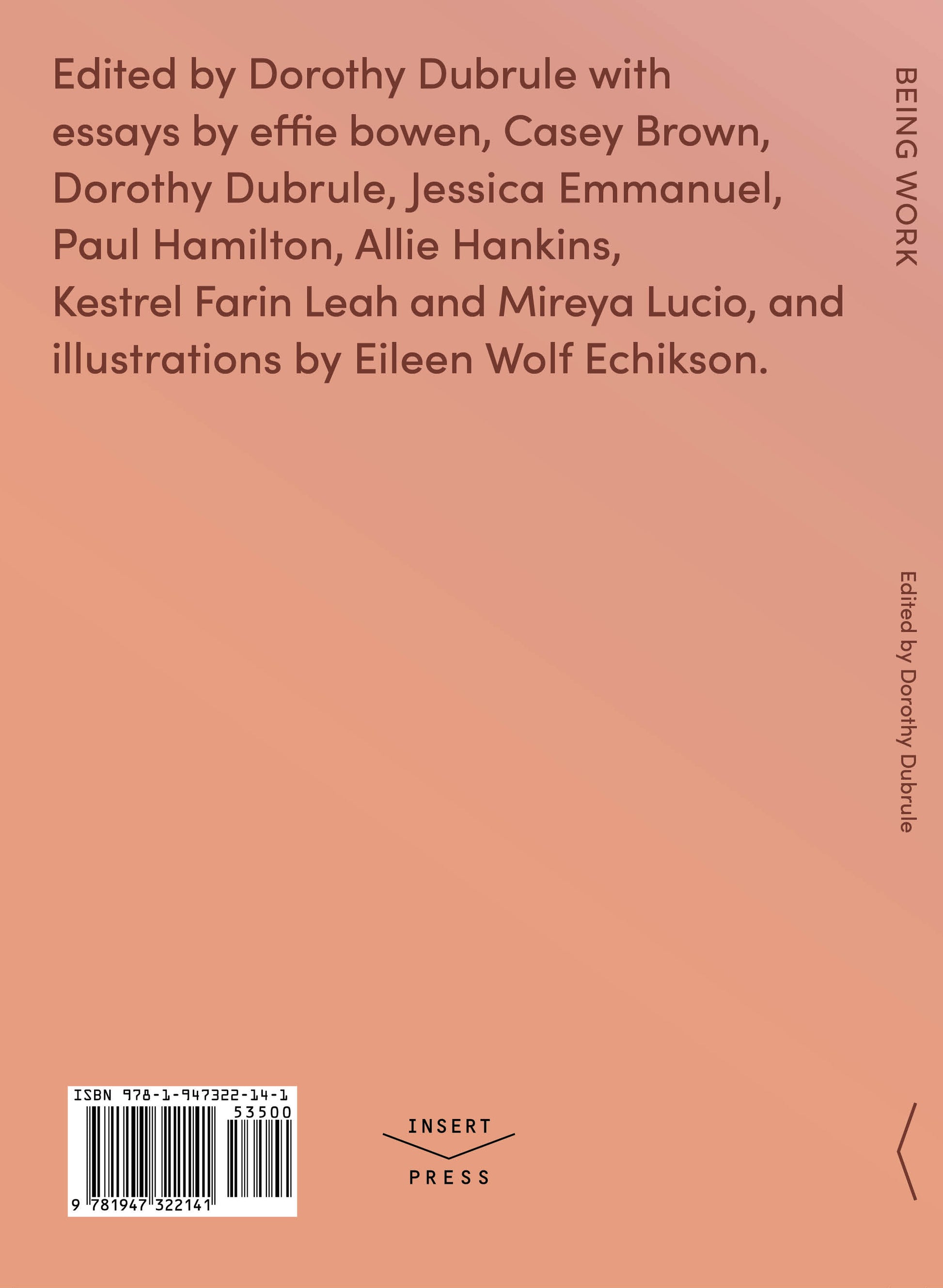 Being Work is a collection of essays by dance and theater artists that offer access to varied experiences of performing in live exhibitions. The authors capture a spectrum of mundane and profound moments that arise within performance gig work in visual arts contexts such as museums, galleries and art fairs, detailing the day-to-day practice of inhabiting art work as well as reflecting on broader questions of how they got there and the impact it has had on their outside lives. While providing very personal, human perspectives on what it feels like to perform in visual arts spaces, Being Work asks its audience how a performer’s labor is perceived and valued in these spaces, and what new possibilities might unfurl within the, at times fraught, coexistence of the two mediums.