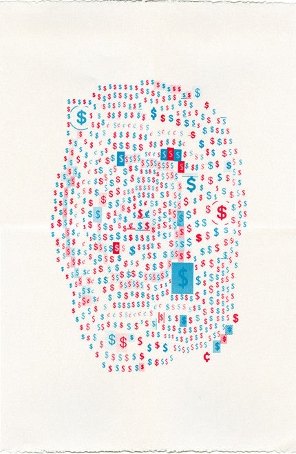 $$$ Cotton Candy – a limited edition of 20 two-color prints available online and at the CREDIT: Installation at Los Angeles Contemporary Exhibitions (LACE) from August 5-26, 2010 (15” x 22” stratford grey rag paper). Quite literally all the Dollars and Cents from the book CREDIT.