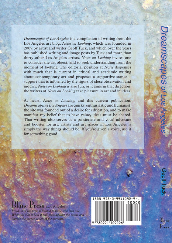 Dreamscapes of Los Angeles is a compilation of writing from the Los Angeles art blog, Notes on Looking, which was founded in 2009 by artist and writer Geoff Tuck, and which over the years has published writing and image posts by Tuck and more than thirty other Los Angeles artists. Notes on Looking invites one to consider the art object, and to seek understanding from the moment of looking. The editorial position at Notes dispenses with much that is current in critical and academic writing about contemporary art and proposes a supportive stance—support that is informed by the rigors of close observation and inquiry. Notes on Looking is also fun, or it aims in that direction; the writers at Notes on Looking take pleasure in art and in ideas.