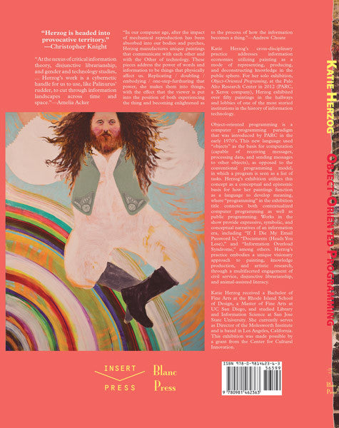 Collecting over fifty plates and thirty installation shots from her exhibition at the Palo Alto Research Center, Object-Oriented Programming exemplifies Katie Herzog's cross-disciplinary practice of representing, producing, and deconstructing knowledge in the public sphere. Works in the show provide expressive, symbolic, and conceptual narratives of an information era, including “If I Die My Email Password Is,” “Documents (Heads You Lose),” and “Information Overload Syndrome,” among others. Herzog’s practice embodies a unique, visionary approach to painting, knowledge production, and artistic research, through a multifaceted engagement of civil service, disjunctive librarianship, and animal-assisted literacy.