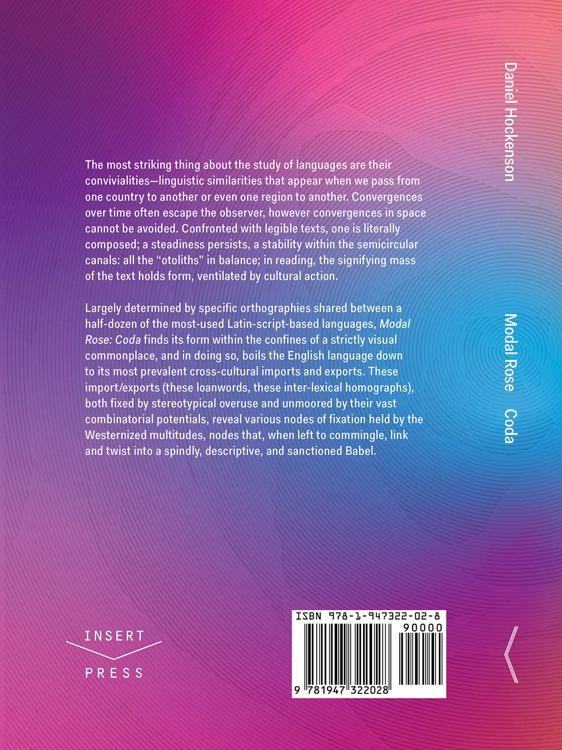 Comprised of 13 non-traditional double sestinas and largely determined by specific orthographies shared between a half-dozen of the most-used Latin-script-based languages, Modal Rose: Coda finds its form within the confines of a strictly visual commonplace, and in doing so, boils the English language down to its most prevalent cross-cultural imports and exports. These import/exports (these loanwords, these inter-lexical homographs found common to English, French, German, Italian, Portuguese, and Spanish), both fixed by stereotypical overuse and unmoored by their vast combinatorial potentials, reveal various nodes of fixation held by the Westernized multitudes, nodes that, when left to commingle, link and twist into a spindly, descriptive, and sanctioned Babel.