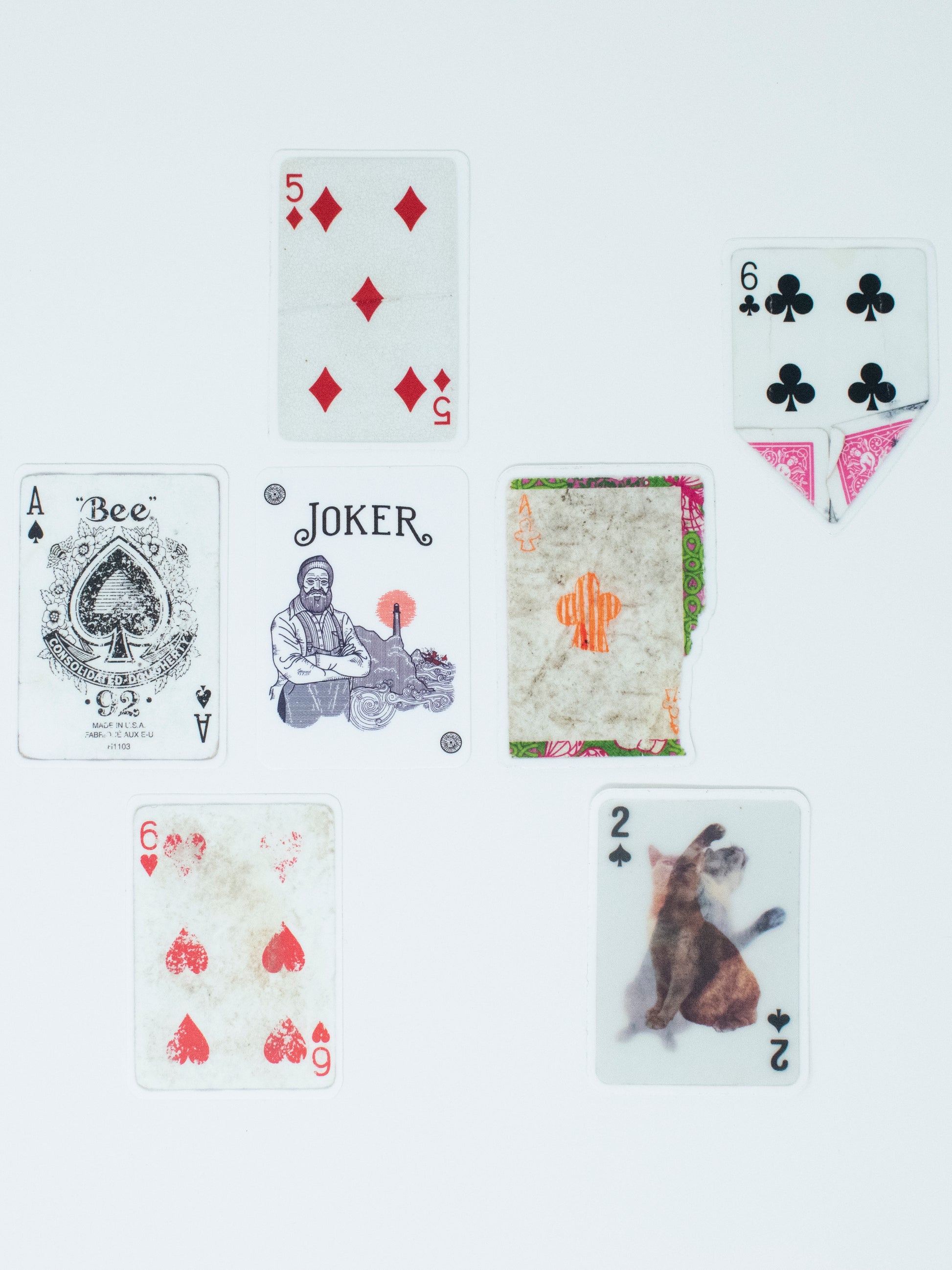Die cut stickers featuring cards from L.A. Deck and NYC Deck by Daniel Newman, 3" x 2.125".
