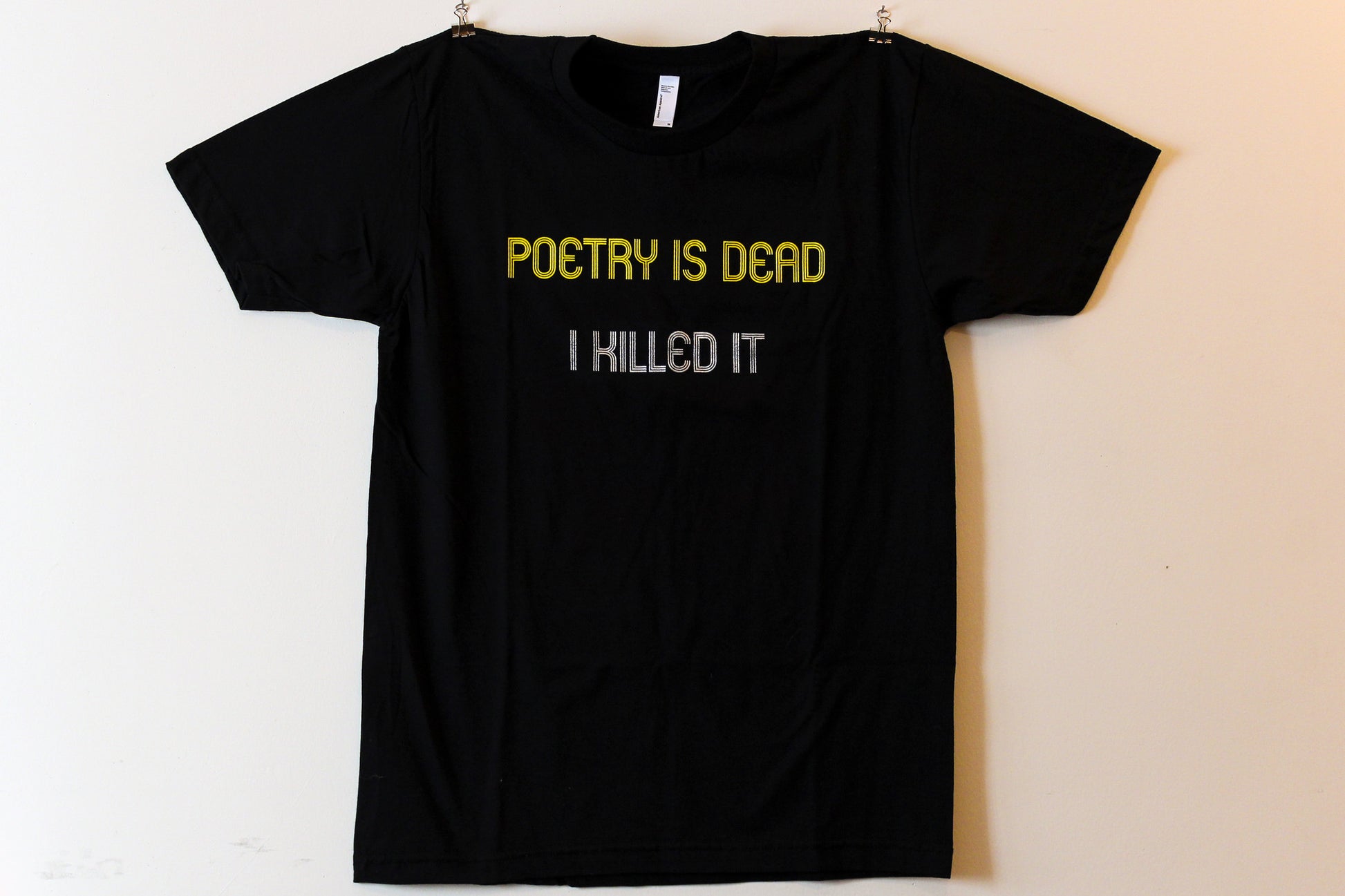 Yep, you killed it. 100% cotton, black American Apparel t-shirt with "POETRY IS DEAD / I KILLED IT" text, hand silk-screened in Los Angeles, CA. Limited Kickstarter edition.